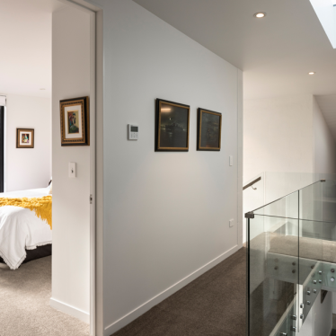 Fulfilling this purpose, vertical metal cladding wraps up and over an enigmatic angular form that sits close to a cliff edge. From the street, glimpses of glazing, living areas, vertical cedar cladding and low-maintenance bagged masonry can be seen from oblique angles. However, the visual impact of the metal cladding cutting through the centre of the site draws the eye, and provides a sense of the mysterious.