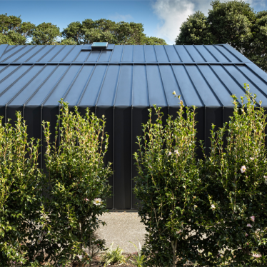 Fulfilling this purpose, vertical metal cladding wraps up and over an enigmatic angular form that sits close to a cliff edge. From the street, glimpses of glazing, living areas, vertical cedar cladding and low-maintenance bagged masonry can be seen from oblique angles. However, the visual impact of the metal cladding cutting through the centre of the site draws the eye, and provides a sense of the mysterious.