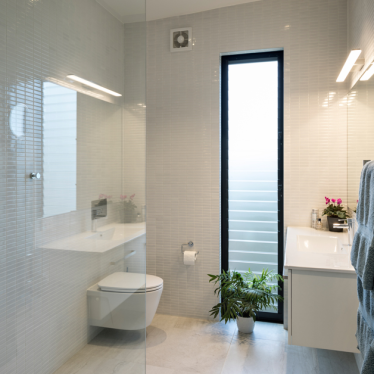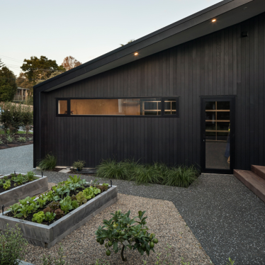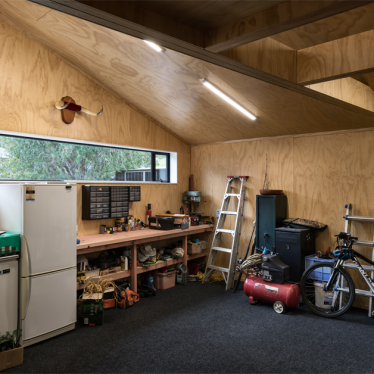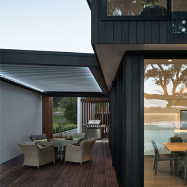 A number of outdoor living areas are apportioned along three edges of the home. These are screened and sheltered to provide protection against prevailing and unpredictable winds. The angular roof form ties a single storey garage to the first floor bedroom and living spaces, folding gently over the rectangular south-eastern façade.