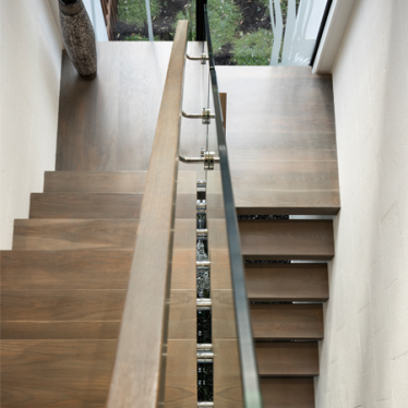 A central stairwell framed by double-height glazing works in tandem with an aligned skylight and void, creating a light well through the heart of the home over an interior garden.