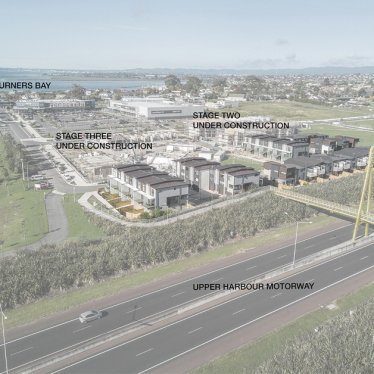 Seen from the major Upper Harbour Motorway, with a new eye-catching yellow pedestrian bridge, the 41-unit development is the first of three stages. This made it paramount to maintain visual interest and intrigue throughout the development. The attractive and practical architectural outcome embodies the principles of resilience, adaptability and cost-efficiency all considered in the design process.