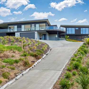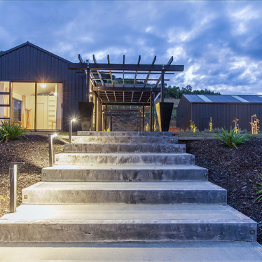 From the road the developments are sleek and unobtrusive, cut close into the slope to achieve a minimal disturbance on the horizon, and coloured a dark charcoal to recede further into the landscape. The vertical profile of the cladding adds texture back into the architecture and is an attractive foil to the long horizontal aspect.