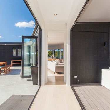A retained courtyard to the rear of the house creates an ideal entertaining area, capturing the afternoon sun.The house is clad in a mixture of dark stained grooved ply and dark vertical profiled metal cladding.