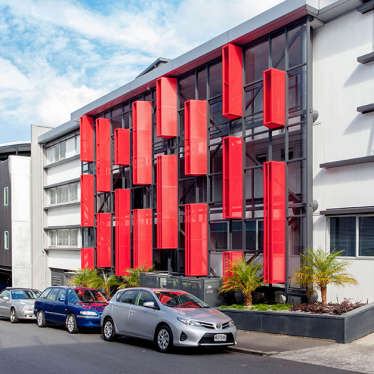 Low maintenance materials have been applied to the outer fabric of the building with eyebrows added for weather and sun protection with the brows providing a horizontal contrast to the vertical form of the red boxes.