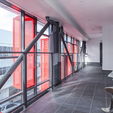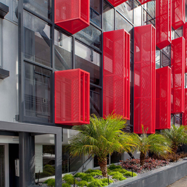 The red box vents provide a practical solution as well as a sculptural element to the façade, bringing depth and interest to the apartment building.