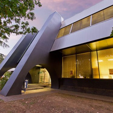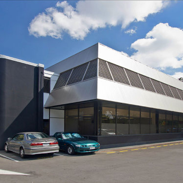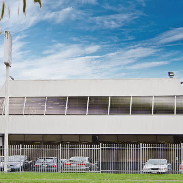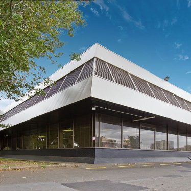 The late 1970s two storey building had a distinctive angled facade concealing an open-air walkway around the perimeter of the first floor. We replaced the aging damaged cladding with Nuwall aluminium vertical panels following the angle of the existing facade. New fixed louvres were installed around the walkway to provide weather protection and screen the offices from the sun.