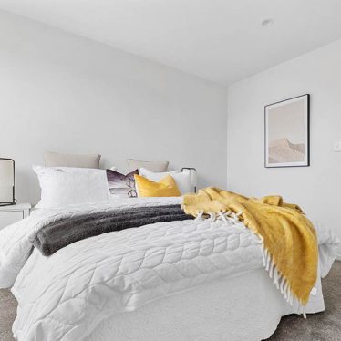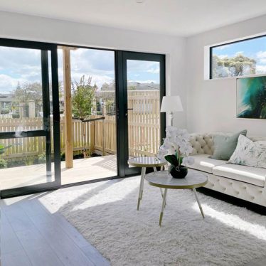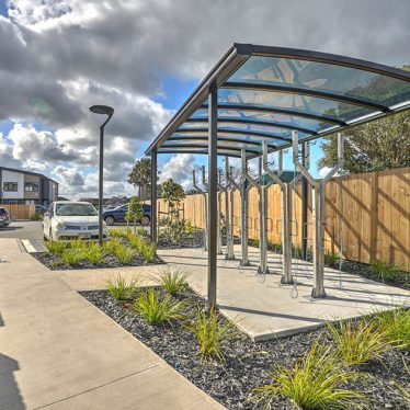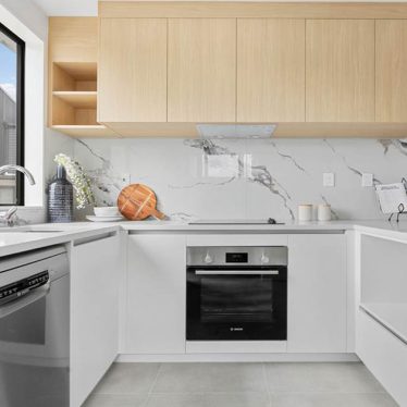 Open plan living, dining and kitchen spaces are filled with natural light, flowing out to decks surrounded by evergreen planting. Shared green spaces create places for the community to connect.