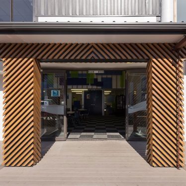 Cantilevered Laminated Douglas Fir posts provide structural support for the panels along the bridge, while providing warmth to the interiors and a connection to the cedar patterns identifying the entrances into the building. This has been linked through to the existing space with the same materials, colours and patterns being recycled into the existing breakout spaces, providing one cohesive environment.