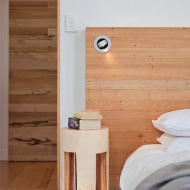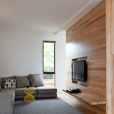 Internally, the high raking ceilings create a light-filled space, and louvre windows allow fresh air to flow through the home. Recycled NZ Tawa has been introduced internally, featuring in surface sliding doors, bedroom and lounge room feature walls.