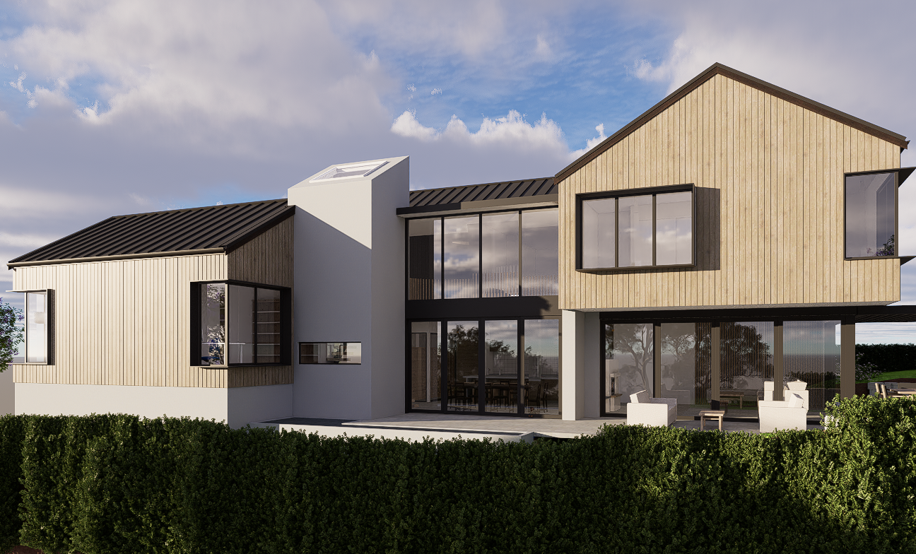 The gable anchors the home in tradition, while full-height glazing and cantilevered elements bring a crisp modern edge.