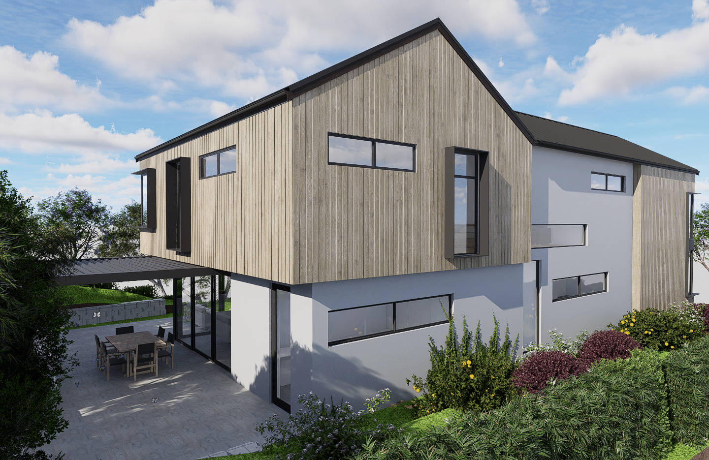 A bold interplay of natural textures and clean geometry, this contemporary residence balances warmth and strength through vertical timber cladding and sleek concrete forms.